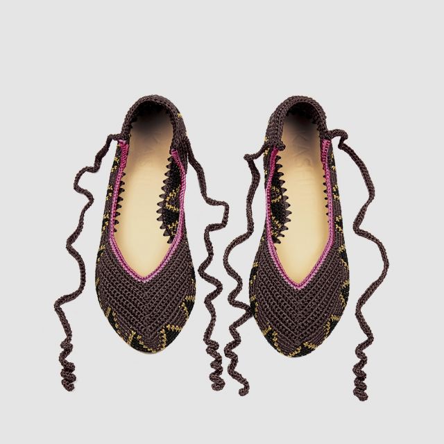 Ballerine lavorate a maglia all'uncinetto con fili in seta e rayon dai colori intensi e luminosi, laccetti, punta tonda, senza tacco, interno in pelle, suola di cuoio e gomma