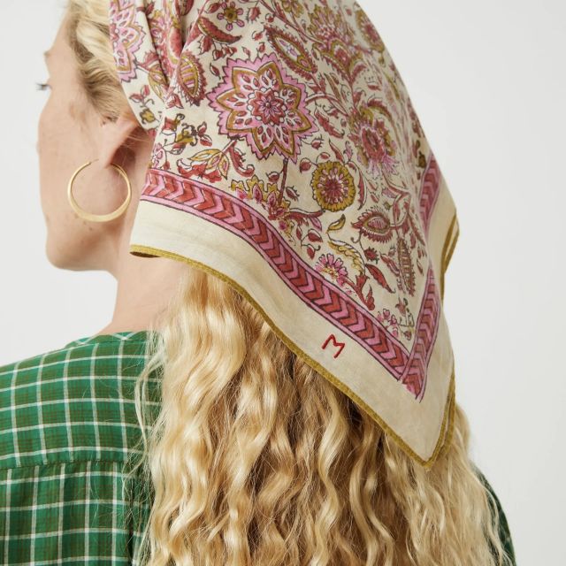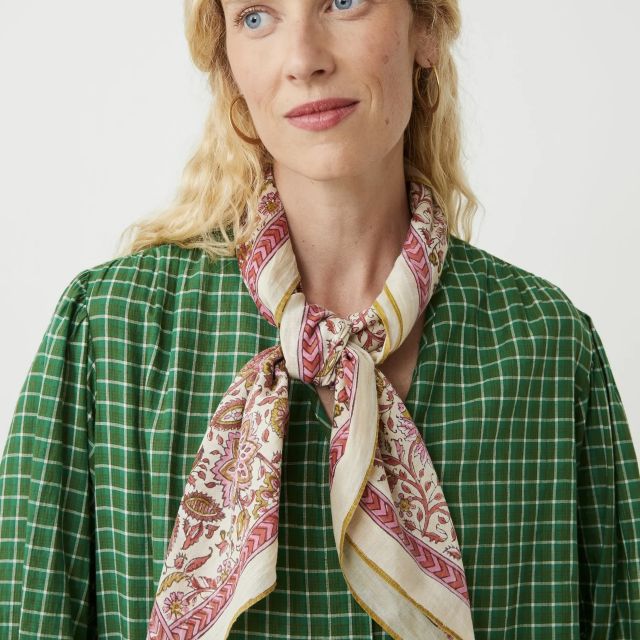 La sciarpa Agra N°823 rivela tutta la delicatezza e la leggerezza del cotone naturale attraverso una stampa floreale creata utilizzando la tradizionale tecnica di stampa a blocchi con blocchi di legno. Il discreto ricamo "M" aggiunge un tocco caratteristico, rendendo questa sciarpa un accessorio da legare intorno al collo o tra i capelli.