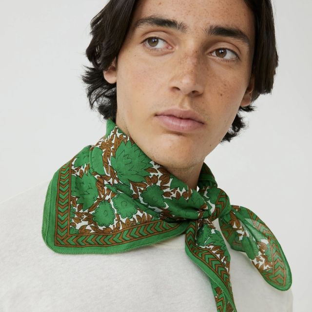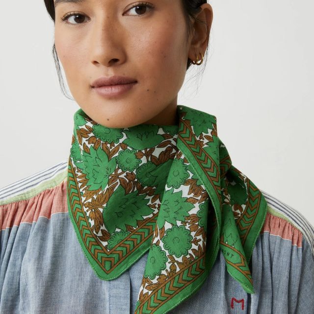 La sciarpa Ajmer N°791 mette in mostra la leggerezza e la morbidezza del cotone in un elegante motivo floreale bicolore. Realizzato in cotone naturale, questo quadrato di 67x67 cm può essere legato intorno al collo o tra i capelli per un tocco delicato e raffinato. Il bordo chevron definisce con precisione il contorno della sciarpa. Un accessorio semplice ed elegante che è facile da indossare tutti i giorni.