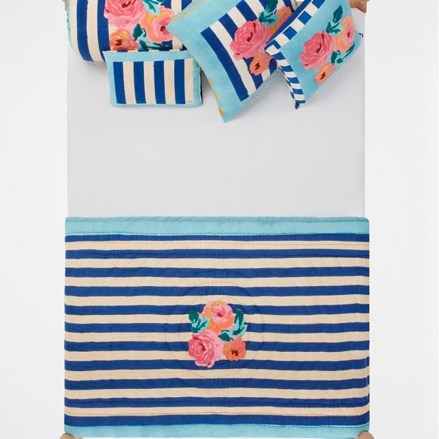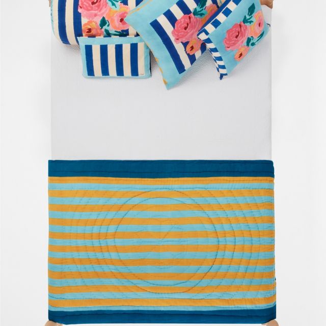 Ogni copriletto in mussola di cotone di Lisa Corti è stampato a mano, la selezione dei materiali e le cuciture, fatte una a una da diversi artigiani, rendono ogni oggetto unico, accogliente e ricercato.