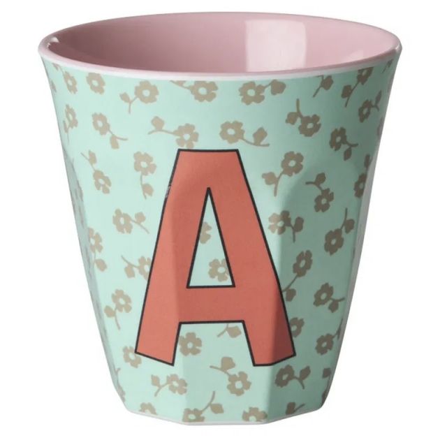 Bicchiere di medie dimensioni (250 ml) in melamina di alta qualità, decorato con una lettera "A” e motivi floreali. È un prodotto resistente, leggero e lavabile in lavastoviglie, non utilizzabile in microonde.