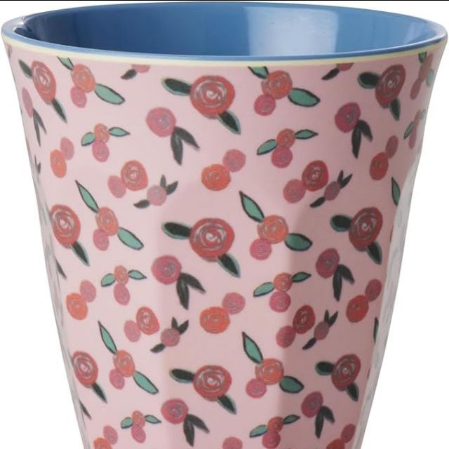 Bicchiere di medie dimensioni (250 ml) in melamina di alta qualità, decorato con motivi floreali. È un prodotto resistente, leggero e lavabile in lavastoviglie, non utilizzabile in microonde.