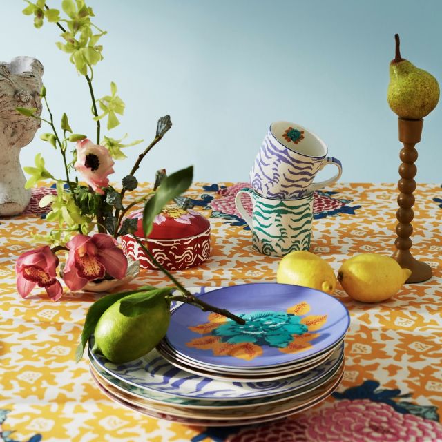 Un disegno concettuale e contemporaneo nato dall'incontro tra l'iconico pattern tigrato di Lisa Corti e il celebre Big Flour. Con i suoi colori decisi, che virano dal rosso al pervinca e dal verde al giallo, lascia immaginare table setting sorprendenti.