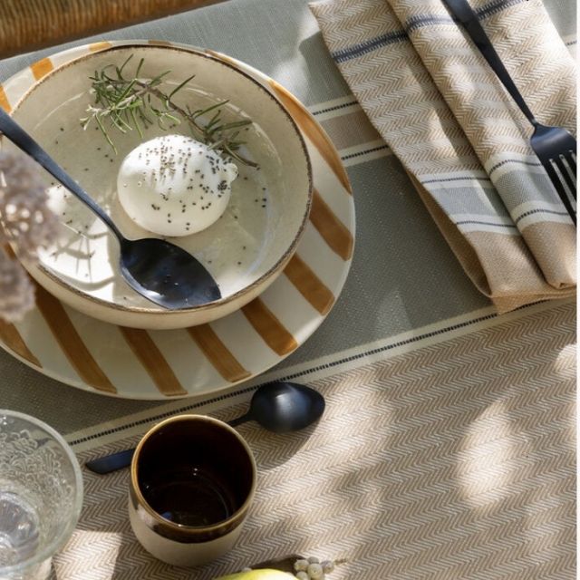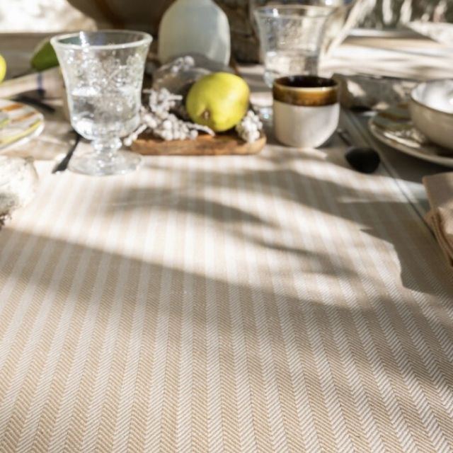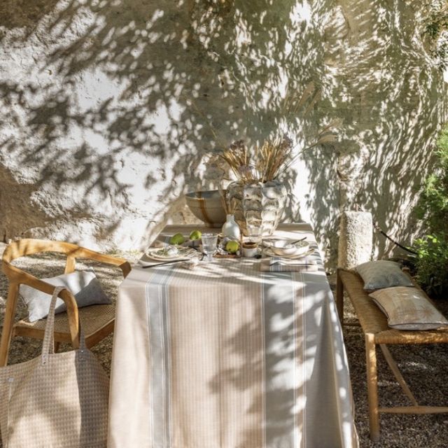 Sotto il sole del Sud, il calore avvolge le case in tadelakt e rivela la semplice bellezza di un sapere tramandato di generazione in generazione. Ispirate alle tende dei pastori del Nord Africa, le righe della collezione Dune celebrano questa eredità ancestrale. Le tonalità di sabbia e di blu profondo restituiscono la luce e il dolce movimento delle dune. Composta per il 61?% da filati «Re-Fil» ricavati dai nostri scarti di produzione, la collezione Dune unisce eleganza e sostenibilità.