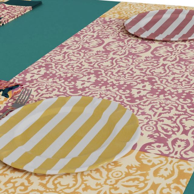 L'iconico disegno Dam Dam ritorna in una inedita variante cromatica che vede l'incontro di due campiture, un caldo oro e un vivace lilla, divise da una fila di maxi fiori. Un motivo che decostruisce la sontuosità dei tessuti rinascimentali grazie ad un'essenziale reinterpretazione contemporanea e all'iconico mix tra elementi geometrici e vegetali. La matrice è stata realizzata artigianalmente con la stampa a blocchi ed è stata poi rielaborata in Italia con tecniche più moderne.