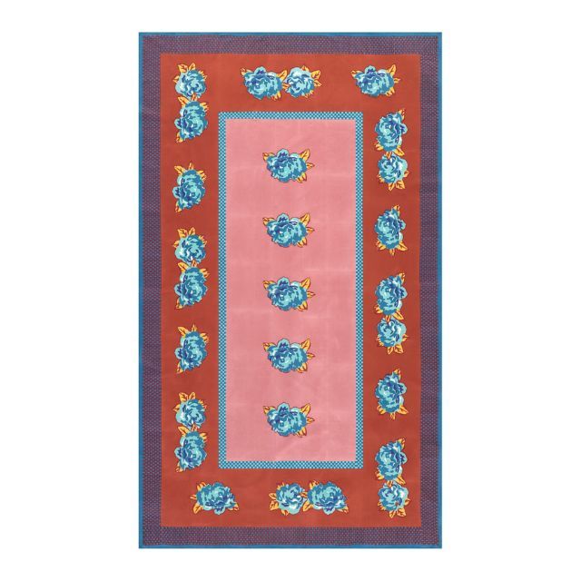 La stampa, firmata Lisa Corti, si ispira a un antico cuscino indiano della dinastia Moghul: una doppia fila di Peonie blu si staglia su due fondi caldi, in un gioco cromatico che unisce eleganza e intensità. Un classico reinterpretato con nuove sfumature, realizzato interamente a mano.