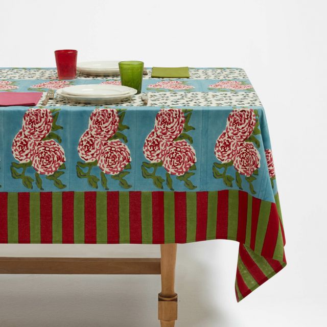 I mezzeri, di antica tradizione italiana, sono cuciti e stampati a mano in tela di cotone. Estremamente versatili, cambiano immediatamente il mood di ogni stanza, che siano su una tavolata per una cena all'aperto, su un comodo divano o usati come festosi copriletti matrimoniali. Questo mezzero è prodotto in India, con tradizionali tecniche di stampa a blocco, un lungo processo artigianale che rende unico ogni pezzo, rendendo preziose anche le sue piccole imperfezioni.