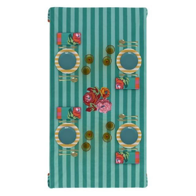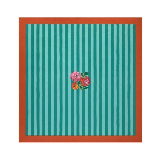 Protagonista del disegno è la rosa Nizam, ispirata a un raffinato tappeto Aubusson, che si staglia su un elegante motivo a righe nei toni del mare più cristallino. Ogni dettaglio è stampato a mano con la tecnica tradizionale “a quadro” dai maestri artigiani indiani.