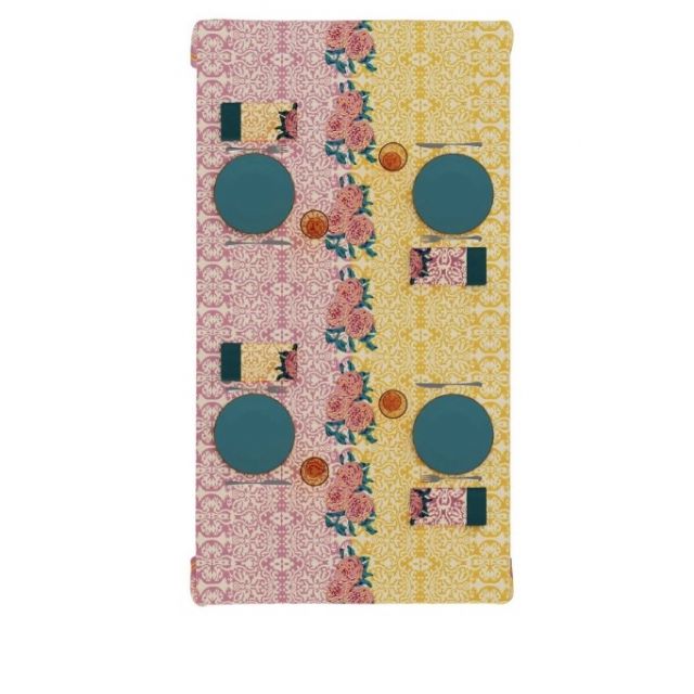 L'iconico disegno Dam Dam ritorna in una inedita variante cromatica che vede l'incontro di due campiture, un caldo oro e un vivace lilla, divise da una fila di maxi fiori. Un motivo che decostruisce la sontuosità dei tessuti rinascimentali grazie ad un'essenziale reinterpretazione contemporanea e all'iconico mix tra elementi geometrici e vegetali. La matrice è stata realizzata artigianalmente con la stampa a blocchi ed è stata poi rielaborata in Italia con tecniche più moderne.