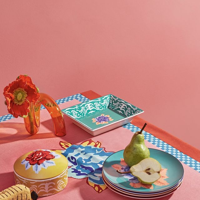 Un disegno concettuale e contemporaneo nato dall'incontro tra l'iconico pattern tigrato di Lisa Corti e il celebre Big Flour. Con i suoi colori decisi, che virano dal rosso al pervinca e dal verde al giallo, lascia immaginare table setting sorprendenti.