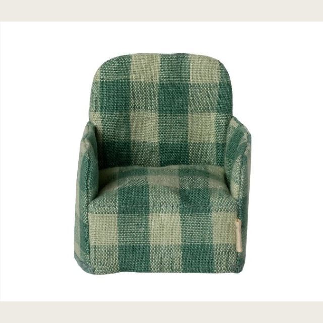 La sedia pieghevole Maileg a scacchi verdi è realizzata in tessuto con struttura rigida interna: arriva piatta ed è facile da montare e richiudere.