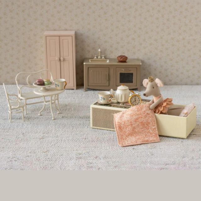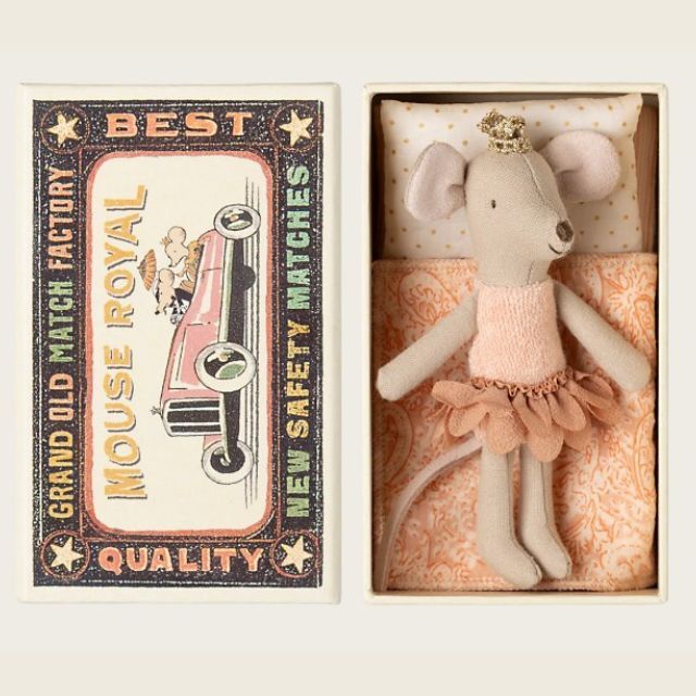 La topina principessa Maileg è pronta per ore di gioco e dolci sonnellini nella sua scatola di fiammiferi, che diventa il suo lettino incantato.