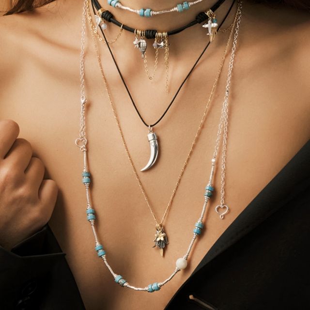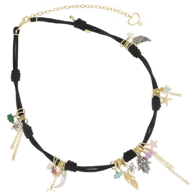 Girocollo di filo di nylon nero con elementi decorativi in argento 925 placcato in oro giallo ad alto spessore ed alta resistenza, pietre pendenti di tanzanite, acquamarina, amazzonite alternate a soggetti vari ispirati al viaggio realizzati in argento 925.